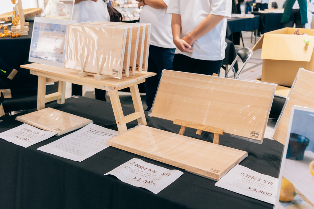 まな板を手に取ったお客さんは檜の匂いも嗅ぐ方々が多く、購入された方の多くに喜んでもらっているとのこと。「今後は宿泊施設などでも取り扱ってもらえるところを増やしていきたい」と将来の展望を語ってくれました。また、まな板だけでなく作業工程中に多数出る細長い端材をカッティングボードに加工して商品化してネット販売など新たなルートも検討中だそうで楽しみが増えそうです。