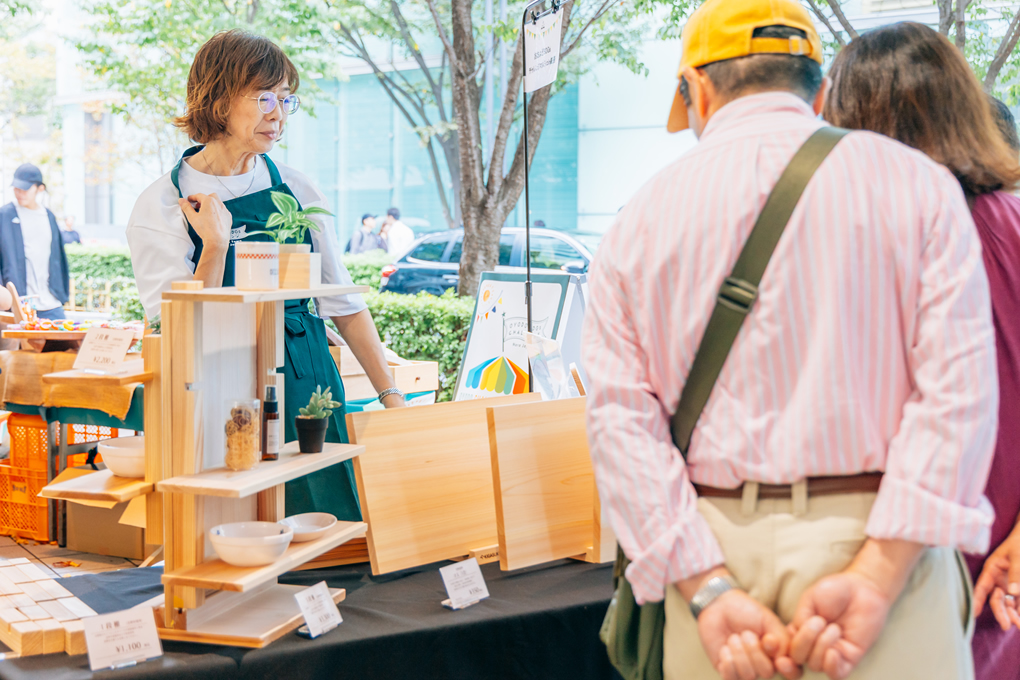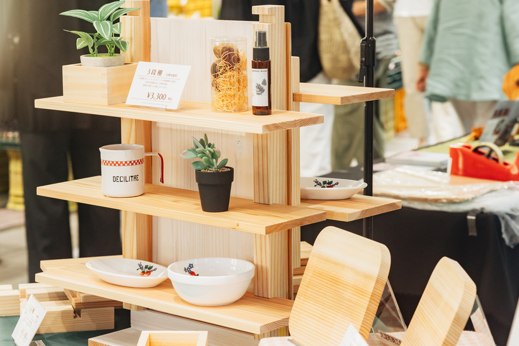今回出品されているのは、木製ランチョンマット・吉野杉の壁付け2段棚/3段棚など。東木材さんは製材所が本業であり、端材を使って安く提供できるアイデア商品が多数。ランチョンマットは布製と違い汚れも簡単に落とせるので人気。